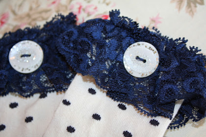 Cream with navy blue polka dots, navy lace and glittery pearl buttons